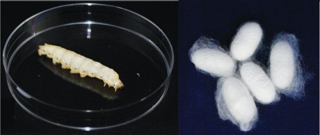 图:进食了添加1% TiO2饲料的家蚕(左)和所得蚕茧(右)