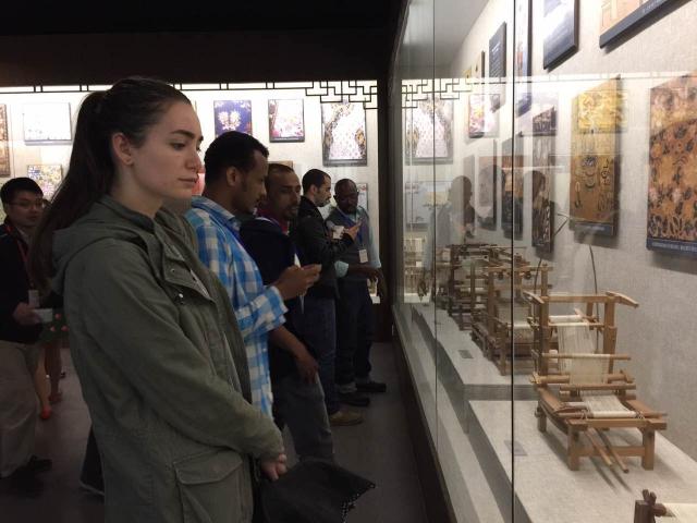 在盛泽镇上的中国盛泽丝绸纺织陈列馆里,留学生们完整而清晰地体验了中国丝绸纺织发展全过程。陈列馆以吴江丝绸业的历史发展为主线,用声光地图、场景复制、年表等多样的视觉呈现形式,从历史渊源、风尚习俗等方面全方位展示了吴江丝绸纺织业的起源、技术变迁和贸易发展等情况。
