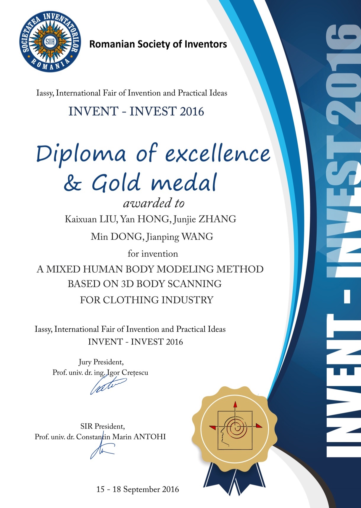 2016年罗马尼亚国家科技创新博览会于9月15日至18日在罗马尼亚隆重举办,有来自英国、法国、俄罗斯、斯洛文尼亚、克罗地亚,保加利亚、乌克兰、罗马尼亚等国家近千人参会。通过各国专家的综合评比,我校参展发明《基于3D身体扫描的混合人体建模新方法》,凭借在3D服装设计中的人体快速建模方面的突出贡献,从200多个发明项目中脱颖而出,收获创新博览会发明金奖,服装与艺术设计学院博士生刘凯旋为第一发明人。