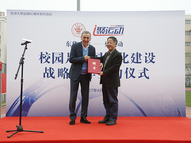 金海燕在签约仪式上讲话,向与会者介绍了学校足球运动开展情况,并预祝双方合作圆满成功。他说,我校是教育部批准的培养高水平足球运动员的试点大学,有较好的足球运动传统,学校足球队曾在各类比赛中斩获佳绩。学校提出在“十三五”期间依托社会资源进行校园足球“国际化”和“职业化”建设,时值学校足球发展60周年,本次合作是校园足球改革发展的重要举措。他表示,希望双方在未来的合作中优势互补、信息共享、互利共赢,构建双方合作发展的新平台、新机制,进一步深化资源利用、业务整合,提升校园足球技战术水平,开拓国际视野、提升创新能力,实现校园足球发展新跨越。