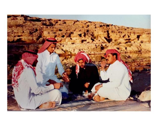 (杜拉同学的亲戚在农村玩,喝咖啡聊天,右二为是杜拉的舅舅。20世纪-90年代-民族服装照-沙特阿拉伯-杜拉 提供)