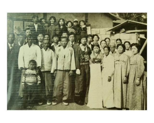 (1945年韩国柳礼贞同学外公的妹妹结婚(中间左三穿白色上衣是她的外公) 20世纪-40年代-婚礼服-韩国-柳礼贞 提供)