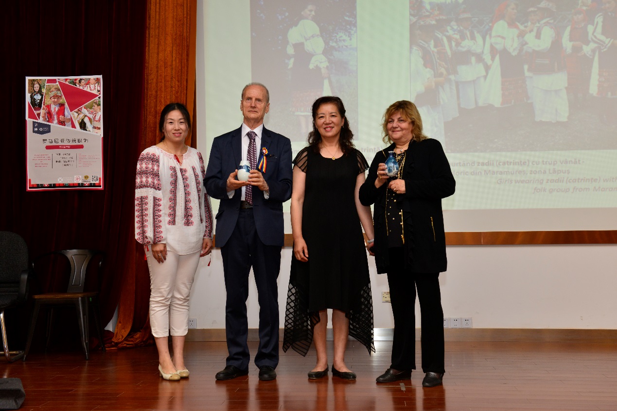 (袁孟红(右二)代表学院向罗马尼亚国务秘书(右一)及北京罗马尼亚文化中心主任鲁博安先生赠送纪念品)