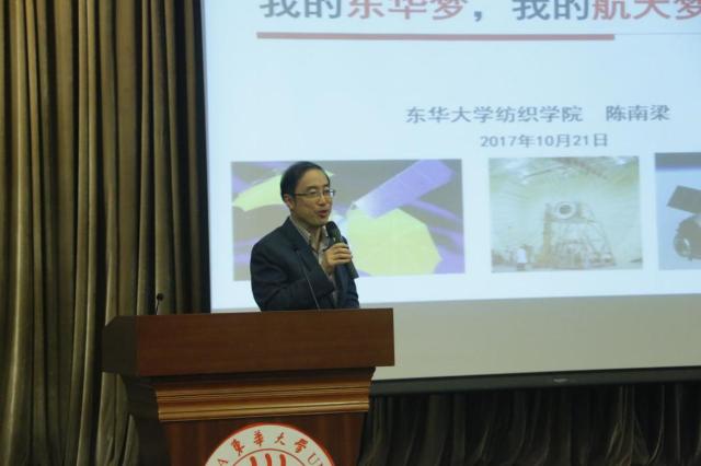 纺织学院院长陈南梁教授作为教师代表应邀在大会上发言。作为“天宫一号”、“天宫二号”和首批货运飞船上天“翅膀”的“编织人”,陈南梁教授的发言吸引众多校友关注,“我的东华梦,我的航天梦”、“纺织科学与工程一流学科建设规划”等热点话题,让在座的东华人无比自豪。