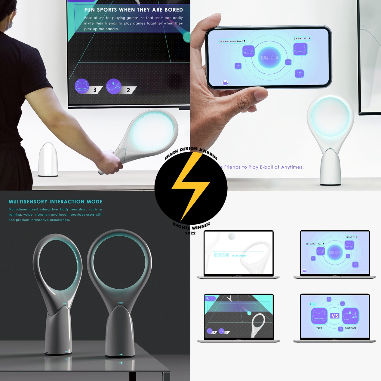 该设计灵感源于新冠肺炎疫情下人们的现实困境。由于保持社交距离是遏制新冠病毒传播的有效手段之一,但对居家中的人们来说会产生孤寂、焦虑等负面情绪。这是一款运动游戏手柄,用于在自我健康管理期间缓解用户的消极情绪。它利用体感和无线网络技术实现室内运动和隔离区的互联。它不仅是一个用来满足人们的室内运动和社会交往需求的物联网球拍,也是一款温暖的陪伴小夜灯。