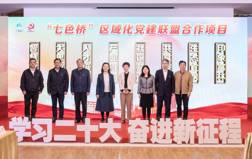 (崔运花与各高校代表、松江区委相关领导共同发布“七色桥”区域化党建联盟合作项目)